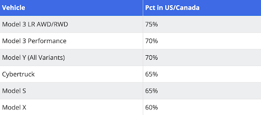 This table shows the percentage of Tesla’s parts made in North America.
