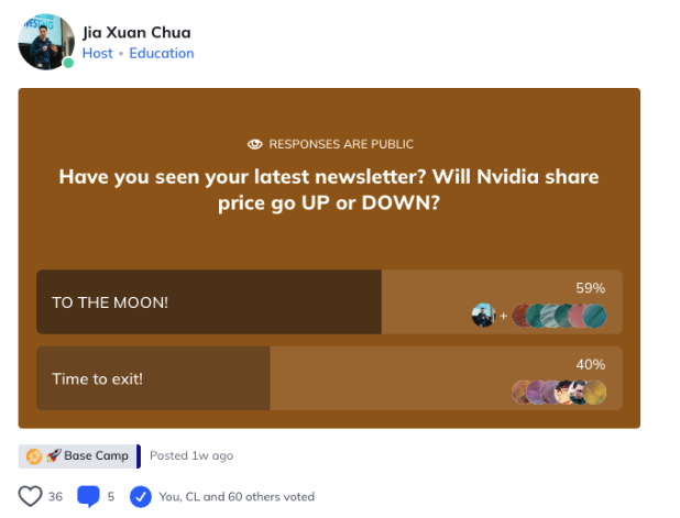 Last week, I asked a poll on the share price trajectory of Nvidia before it’s earnings. Just want to shout out to the 61 of you awesome people that voted the poll.