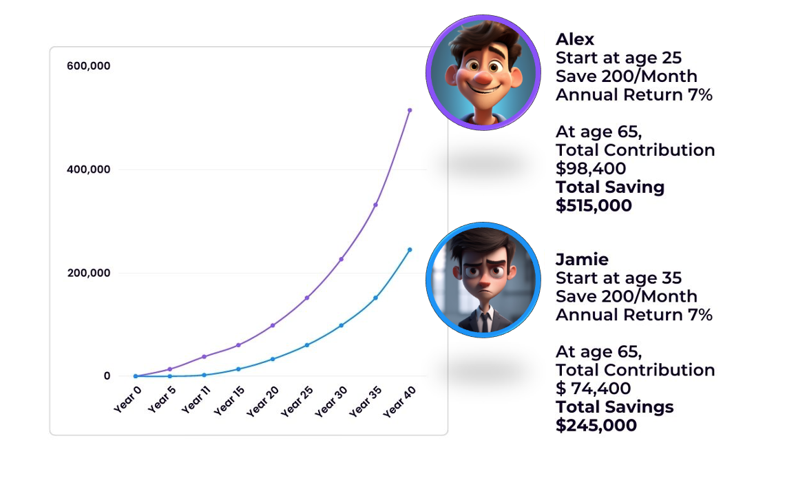 Consider two individuals, Alex and Jamie. Both decide to invest $200 a month, but they start at different ages.